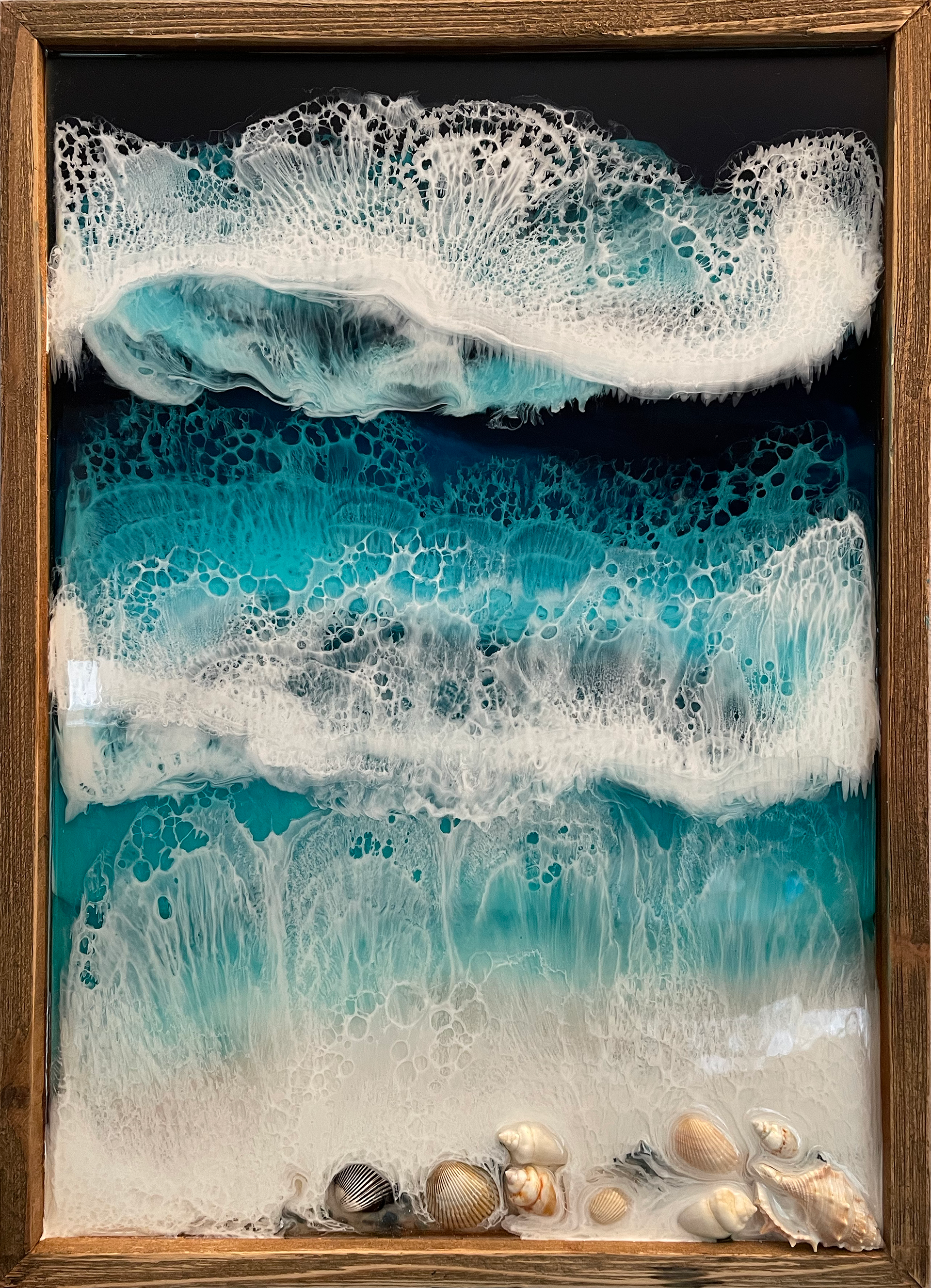14" x 19.5” (Framed) | Acrylic, Resin, and Shells on Hardboard Panel | 2021
